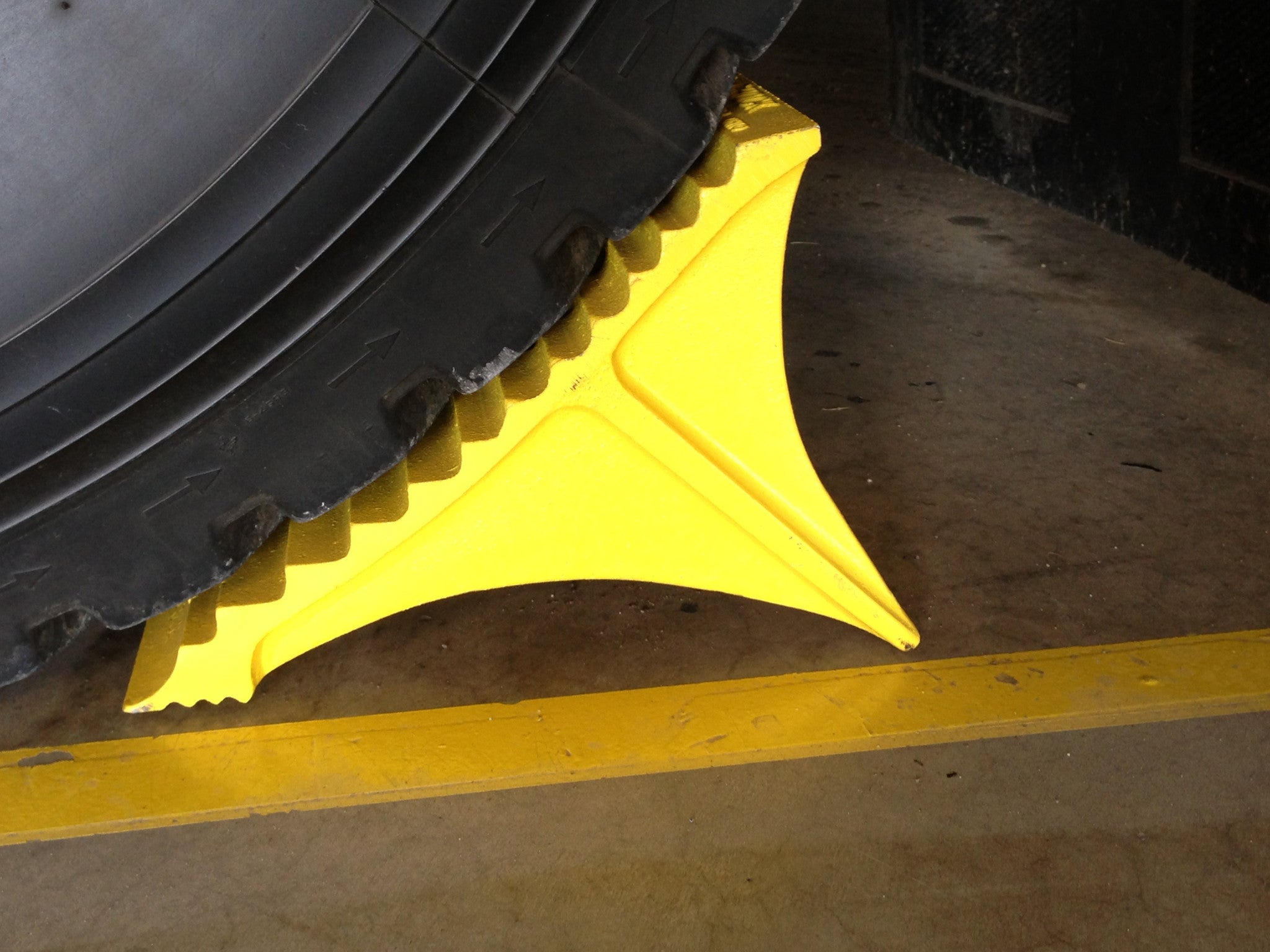 Safety starts with visibility and control. Wheel chocks stop trailers from rolling. Yellow guards protect walls and equipment. Caution signs warn everyone of potential hazards.